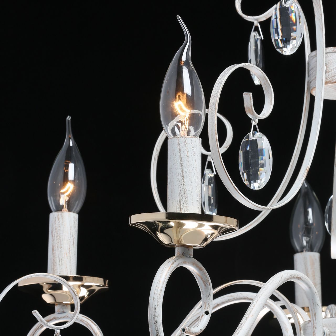 Классическая форма рожков-свечей белого цвета с золотистой патиной. Подвески из прозрачного хрусталя и розетки золотого цвета придают легкости. Возможность регулировать высоту светильника за счет звеньев цепи.